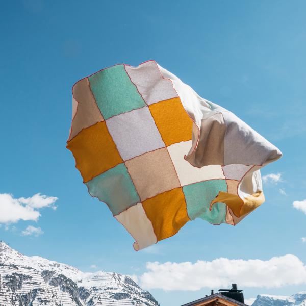 Diese Patchworkdecke in feinster Strickqualität besteht aus 20 Quadraten. Diese sind auf der Vorderseite mit einer fuchsiafarbenen Overloocknaht verbunden. Auf dieser Seite verläuft ein feines Maschenbild. Die Rückseite ist Fleeceähnlich und hat keine Nähte. Somit also perfekt für jede empfindliche Haut. Die besondere Nachhaltigkeit dieses Materials liegt in der Herstellung des sehr hohen recycelten Baumwollanteils. Hierfür werden gebrauchte Textilien sehr sorgfältig nach Farben sortiert. Ist dies geschehen, werden sie in kleinste Fasern zerteilt, gewaschen und mit einer Zugabe neuer Fasern wieder zu Garn versponnen. Der positive Effekt ist, Baumwolle muß nicht neu gepflant und gewässert werden, das Garn nichtmehr gefärbt werden. Die Umwelt wird nachhaltig geschont.